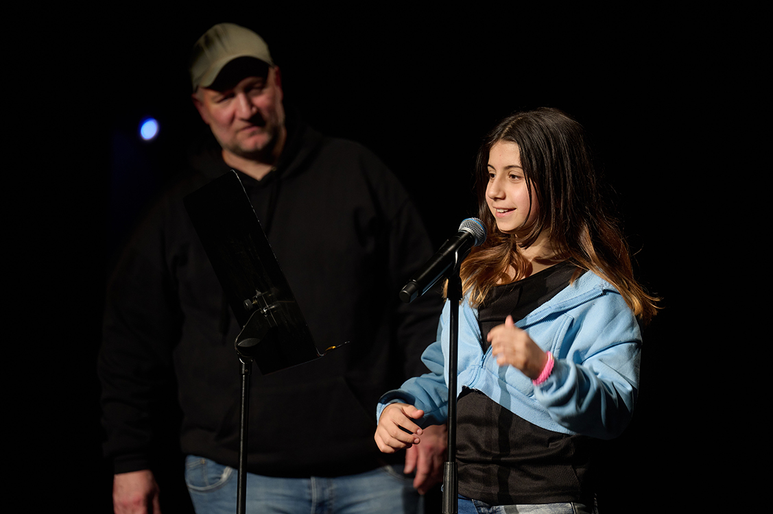 Aber die Antworten der Kinder werden diesem Anspruch gerecht: Voller Phantasie, spielerisch und leidenschaftlich geben sie Einblicke in ihre Seelen- und Gedankenwelt, reagieren auf das eigene Großwerden, die Krisen dieser Welt, die Schönheit der Natur, Freundschaft und Vertrauen. Ob Sophie und Adamo von in ihrer kindlichen Welt ganz realen Hexereien berichten und damit auf den Zaubertrank des Homer reagieren, ob Evelina gebärdet „Wir schreiben, wir sind klug und haben keine leeren Köpfe“ oder Setareh tief durchatmet, als sie den Text ihrer Mitschülerin Vera unfallfrei ins Mikrofon gesprochen hat – die Kinder sind konzentriert bei der Sache und stolz auf ihre Auftritte.