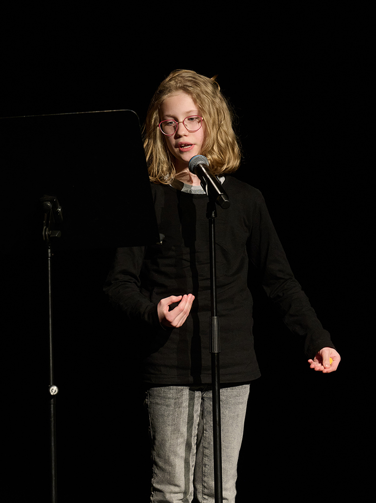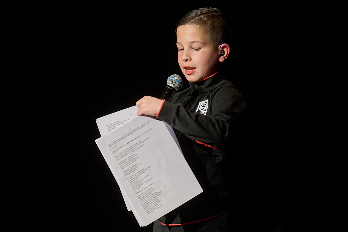 14 Schülerinnen und Schüler der 4. Klassen – alle zwischen zehn und 13 Jahren – haben mit ihrer Klassenlehrerin Kathrin Speier, der Deutschlehrerin Annika Hartmann und der Erzieherin Ankica Polenik seit Ende Februar für diesen Auftritt geprobt, Texte geschrieben, gebärdet, gelesen, auswendig gelernt. Unterstützt wurden sie dabei vom künstlerischen Leiter des Projekts, Florian Cieslik, der an der Wöhlerschule für klassen- und fächerübergreifende Projekte und die Theaterarbeit zuständig ist. Ein Bühnenprofi mit Leidenschaft für Sprache, der auch Workshops zu kreativem Schreiben und Poetry Slam anbietet.