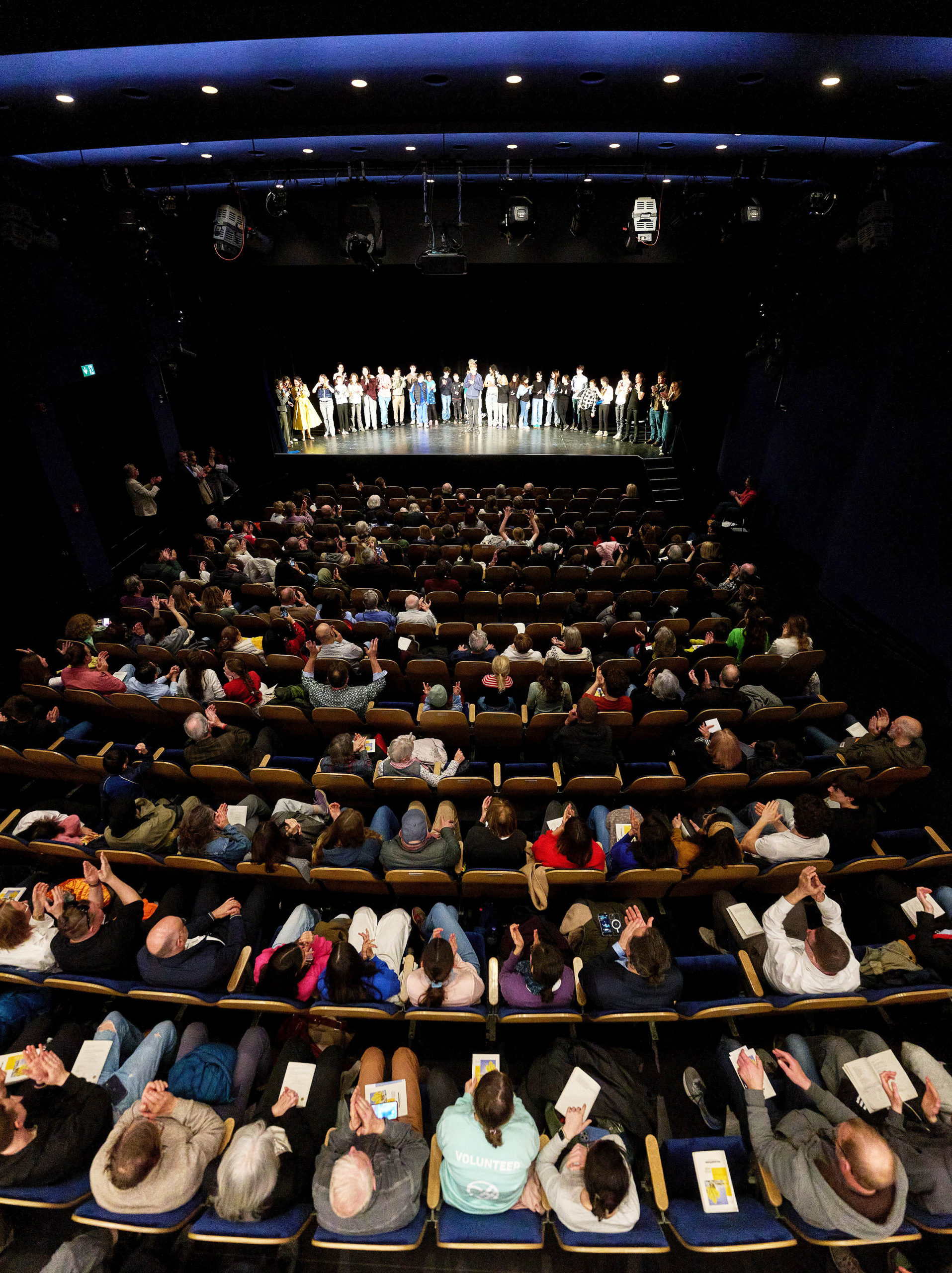 Nur sehr versteckt spielen die Kinder dabei auf ihre Einschränkungen an – auch wenn das Thema Hören und Nicht-Hören-Können immer präsent ist, allein schon, weil die Gebärdendolmetscherinnen ständig im Einsatz sind. Auch das Publikum lässt sich nicht lange bitten, seinen begeisterten Applaus nicht nur hörbar durch Klatschen, sondern mit sichtbaren Händen, der Gebärde für Beifall, auszudrücken.