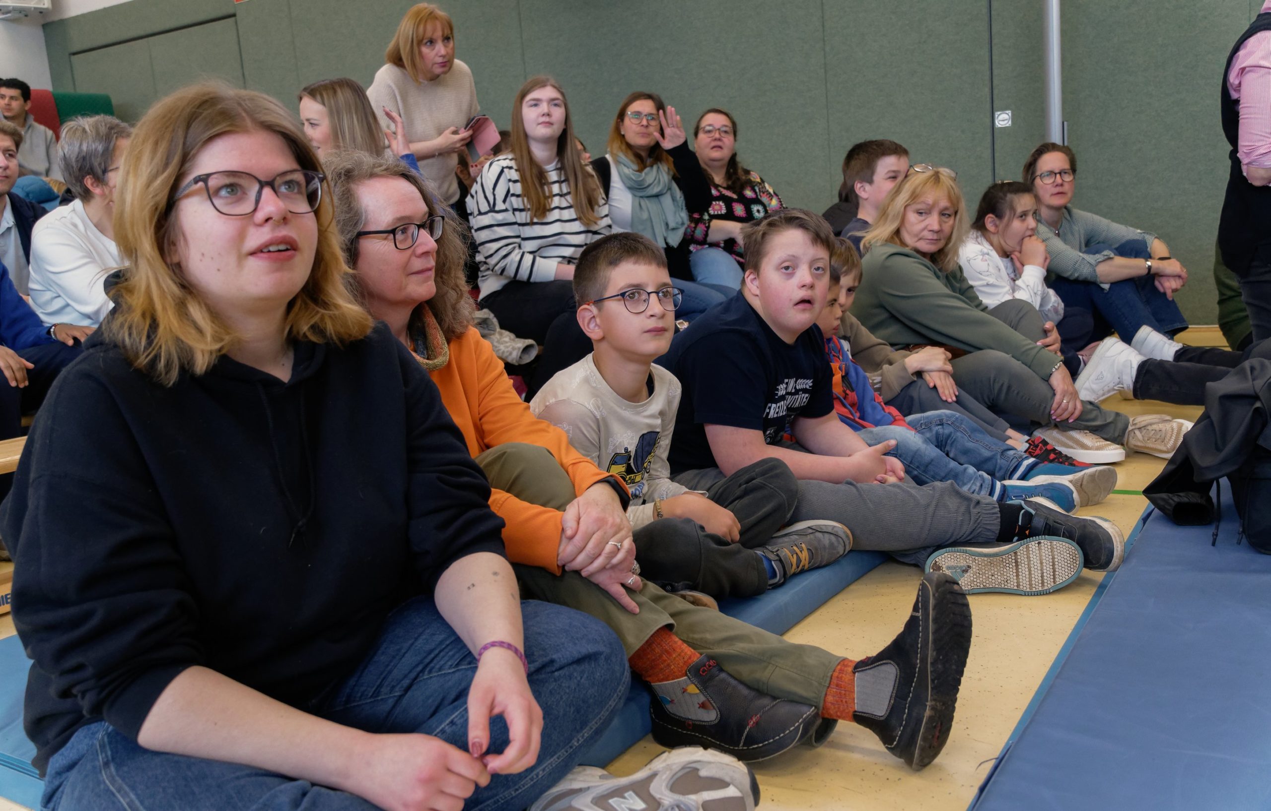 Die Jüngsten wuseln durch die Tür, finden ihre Plätze und schon ist von den für sie ausgelegten Turnmatten nichts mehr zu sehen. Hinten an der Wand hocken die Coolen der Berufsfachschule auf Kästen und Böcken. Gerade noch haben sie dem Team vom Hessischen Rundfunk (hr) beim Aufbau geholfen.